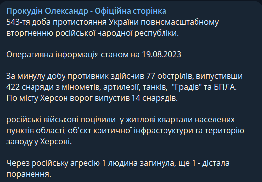 Минулої доби росіяни 77 разів обстріляли Херсонську область, випустивши 422 снаряди з мінометів, артилерії, танків, "Градів" і БПЛА. Містом Херсон ворог випустив 14 снарядів.