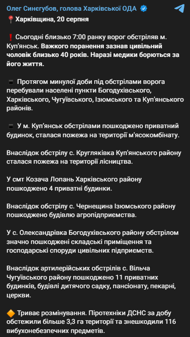 "Сьогодні близько 7:00 ранку ворог обстріляв місто Куп'янськ. Тяжке поранення отримав цивільний чоловік близько 40 років. Наразі медики борються за його життя", - написав Синегубов.