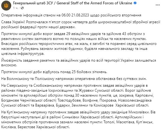 Вранці 21 серпня Генштаб ЗСУ оприлюднив зведення про ситуацію на фронті.
