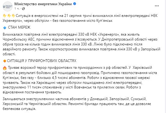 "Припинено газопостачання міста Куп'янськ, без газу - близько 4,5 тисячі абонентів. Роботи з відновлення газової мережі тривають", - повідомляють у Міненерго.