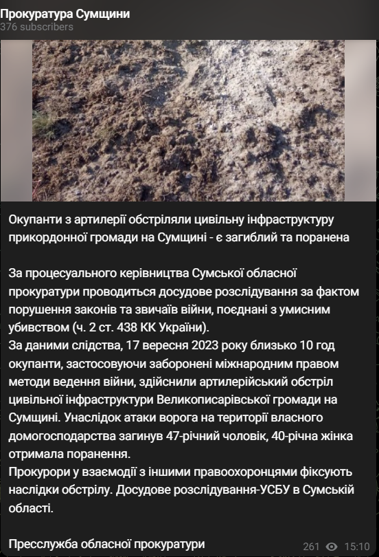 16:00 Сьогодні вранці війська РФ обстріляли Великописарівську громаду на Сумщині. Загинув 47-річний чоловік, 40-річна жінка зазнала поранень.