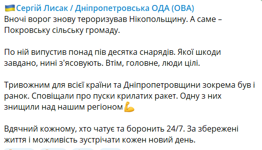 "Тривожним для всієї країни та Дніпропетровщини, зокрема, був і ранок. Повідомляли про пуски крилатих ракет. Одна з них була знищена над нашим регіоном", - написав Лисак.