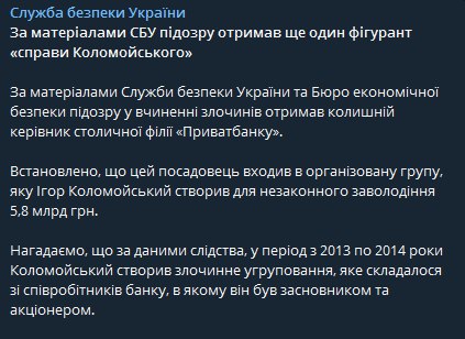 Встановлено, що ця посадова особа входила до організованої групи, яку Ігор Коломойський створив для незаконного заволодіння 5,8 млрд. грн.