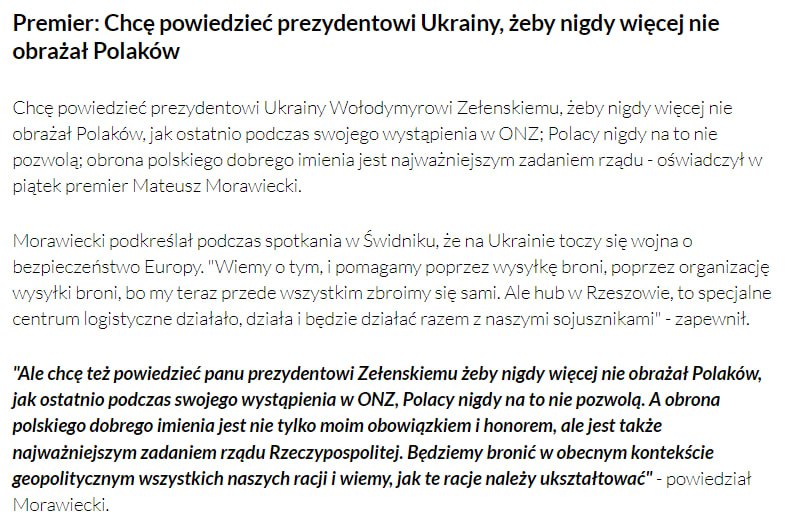 "Я хочу сказати президенту Зеленському, щоб він більше ніколи не ображав поляків, як він це зробив нещодавно під час свого виступу в ООН. Поляки цього не допустять. І захист польського доброго імені – це не лише мій обов'язок та честь, це найважливіше завдання уряду республіки. У нинішньому геополітичному контексті ми відстоюватимемо всі наші аргументи", - наводить агентство слова Моравецького.