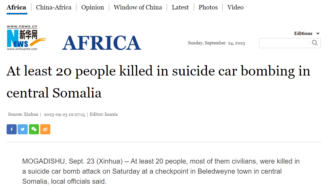 Учора на контрольно-пропускному пункті в місті Беледуейн у центральній частині Сомалі вибухнула замінована вантажівка зі смертником. Від вибуху загинули 20 людей.