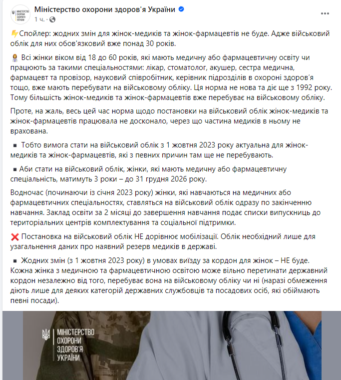 Усі жінки віком від 18 до 60 років, які мають медичну або фармацевтичну освіту або працюють за фахом лікаря, стоматолога, акушера, медсестри, фармацевта та провізора, наукового співробітника, керівника підрозділів у охороні здоров'я тощо, вже повинні стояти на військовому обліку, нагадали в МОЗ Ця норма не нова і діє ще з 1992 року, тому більшість жінок-медиків та жінок-фармацевтів вже перебувають на такому обліку, сказано у пості.