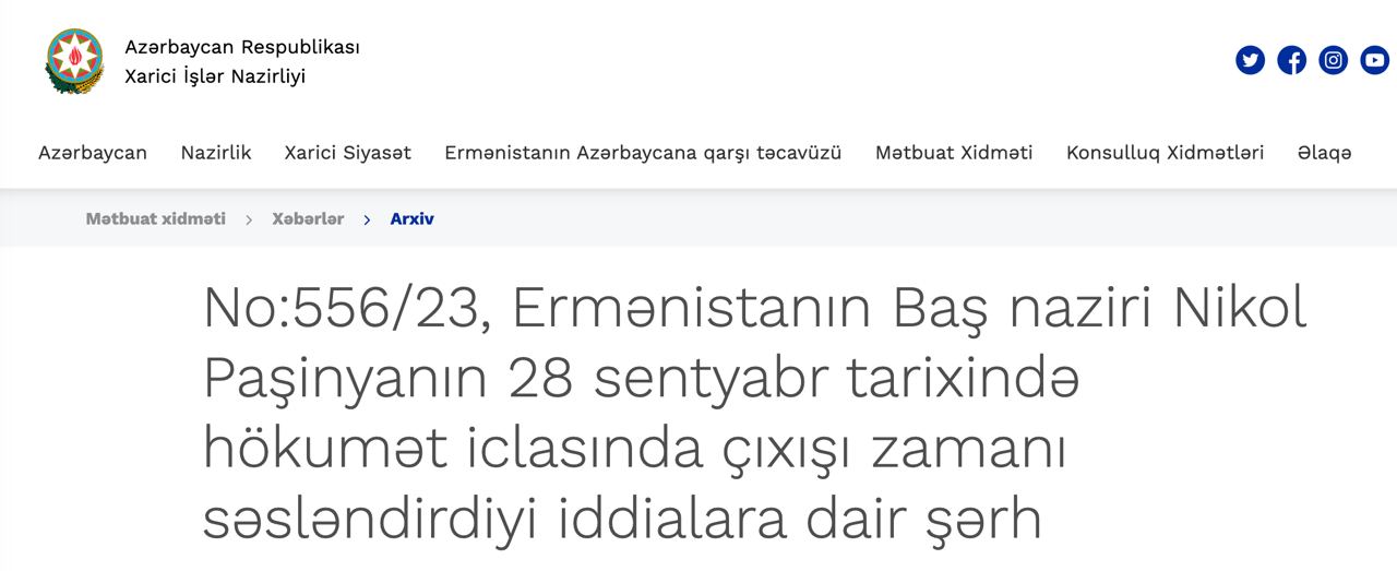 "Прем'єр-міністру Пашиняну добре відомо, що виїзд вірменських жителів є їх особистим індивідуальним рішенням і не має нічого спільного з насильницьким переселенням. Якщо якась частина громадян Вірменії не бажає жити в рамках азербайджанського законодавства та влади, підкоряючись їм, ми не можемо змусити Але ми закликаємо мешканців Вірменії не залишати місця свого проживання, а стати частиною багатоетнічного азербайджанського суспільства", — йдеться у повідомленні.