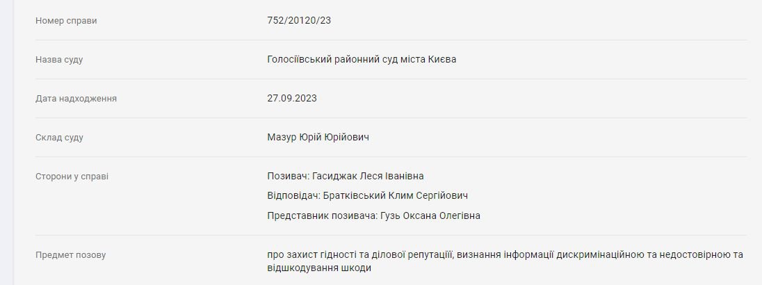У позові Лесі Гасіджак відповідачем зазначено Клима Братковського. Предмет позову - захист гідності та ділової репутації, визнання інформації дискримінаційною та недостовірною та відшкодування збитків.
