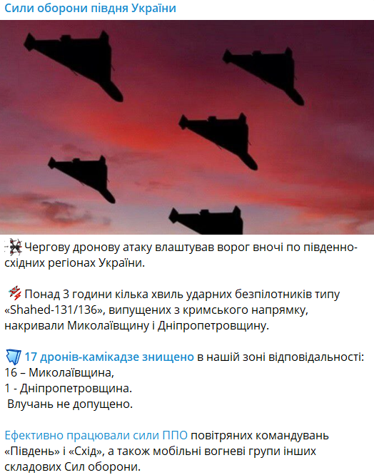 "Понад три години кілька хвиль ударних безпілотників типу "Shahed-131/136", випущених з кримського напрямку, накривали Миколаївську та Дніпропетровську області", - йдеться у повідомленні.