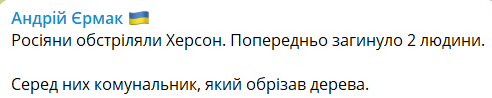 "Росіяни обстріляли Херсон. Попередньо загинули двоє людей. Серед них комунальник, який обрізав дерева", - йдеться у повідомленні.