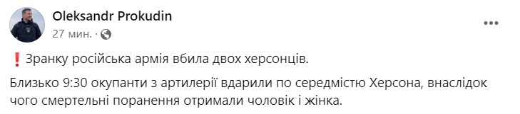 Голова Херсонської обласної військової адміністрації Олександр Прокудін підтвердив інформацію про обстріл міста та повідомив, що загинули чоловік та жінка. За його словами, удар по Херсону завдавав артилерії.