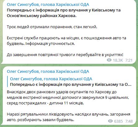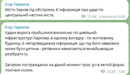 Мер Харкова Ігор Терехов повідомив, що був приліт по цивільній інфраструктурі та по житловому будинку. Є непідтверджена інформація, що під його завалами може бути дитина.