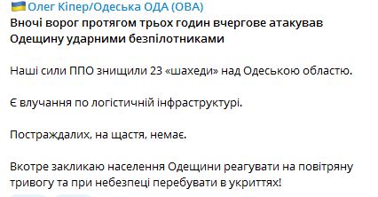 "Є влучення по логістичній інфраструктурі. Постраждалих, на щастя, немає", - написав Олег Кіпер.