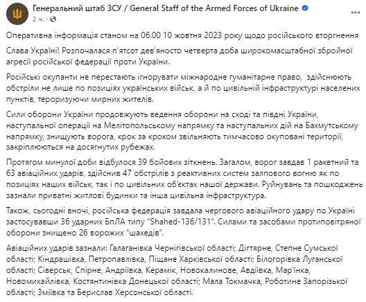 Вранці 10 жовтня Генштаб ЗСУ оприлюднив зведення про ситуацію на фронті.