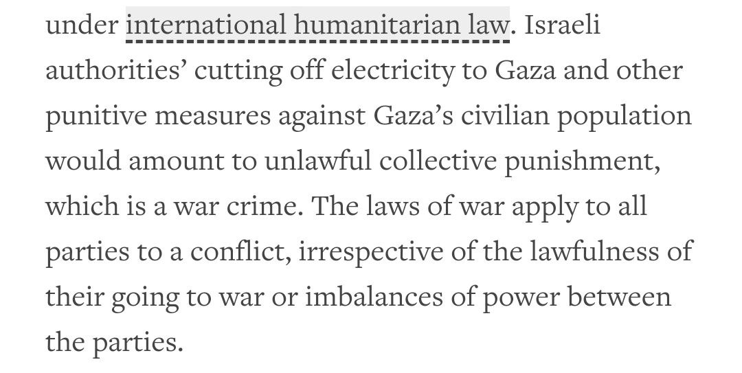 "Відключення ізраїльською владою електроенергії в секторі Газа та інші каральні заходи проти цивільного населення сектору Газа будуть рівнозначними незаконному колективному покаранню, яке є військовим злочином", - заявили в HRW.