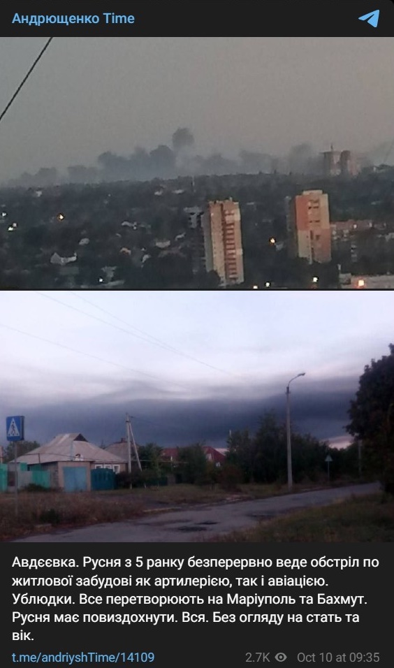 "Авдіївка. Русня з 5-ї ранку безперервно веде обстріл по житловій забудові як артилерією, так і авіацією.
