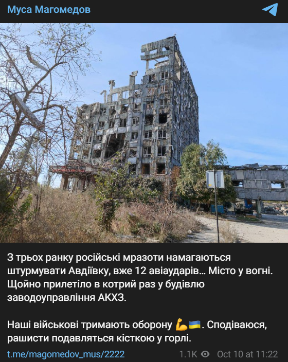 У вівторок, 10 жовтня, російська армія завдає масованого удару артилерією та танками по Авдіївці Донецької області. Поранено двох людей, зруйновано багатоквартирний будинок.