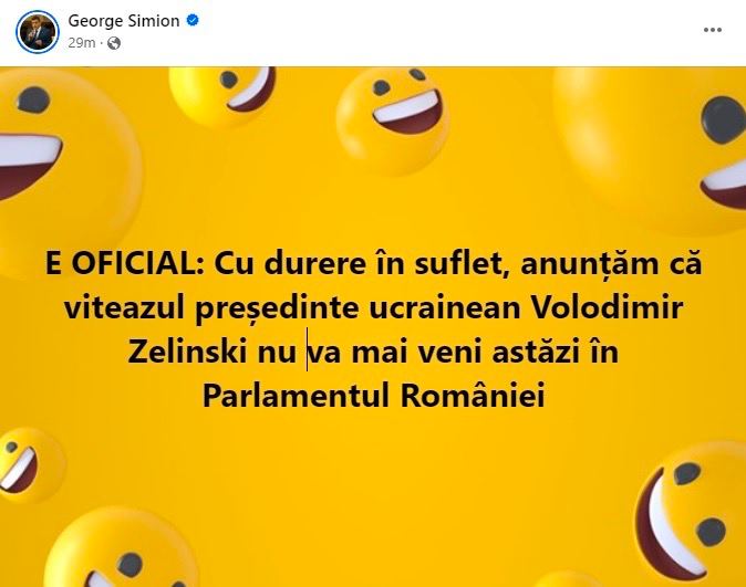 "З болем у серці ми повідомляємо, що хоробрий український президент Володимир Зеленський не прийде сьогодні до румунського парламенту", - написав депутат у Facebook, супроводживши публікацію смайлами, що сміються.