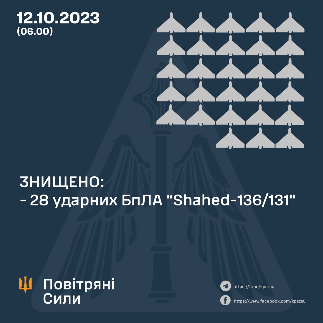 У ніч на 12 жовтня, Росія завдала авіаційного удару по Україні, застосувавши БПЛА типу Shahed-136/131. Інформація про наслідки цієї терористичної атаки уточнюється.