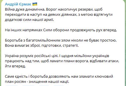 "Війна дуже динамічна. Ворог накопичує резерви, щоб переходити у наступ на деяких дільницях з метою відтягнути додаткові сили нашої армії. В інших напрямках Сили оборони продовжують рух уперед", - написав голова ВП.