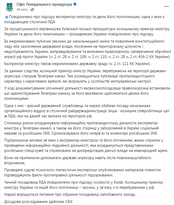 "Їм інкриміновані публічні заклики до насильницької зміни та повалення конституційного ладу або захоплення державної влади, посягання на територіальну цілісність та недоторканність України, виправдання та визнання правомірної, заперечення збройної агресії РФ проти України (ч. 2 ст. 9 ст. 110, ч. 2 статті 28 ч. 2 статті 436-2 КК України. Екс-прем'єр-міністру також інкримінується державна зрада (ч. 2 ст. 111 КК України)", - сказано в пості.