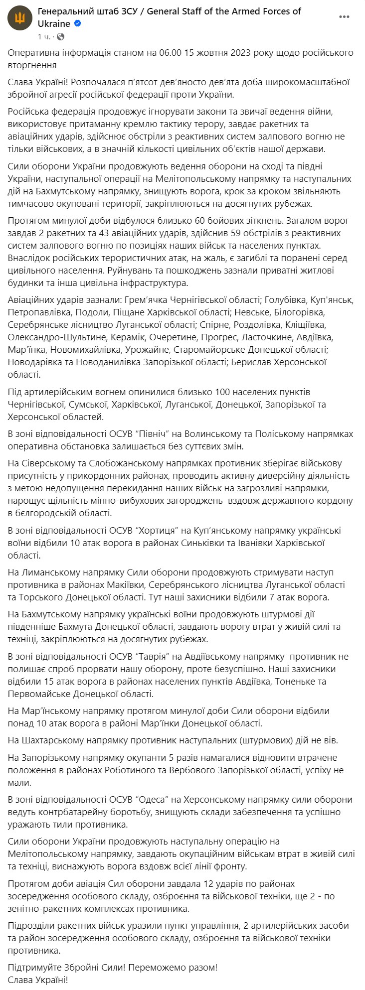 Війна в Україні триває вже 599-й день. Ми стежимо за останніми новинами та ключовими подіями 15 жовтня 2023 року в онлайні, що оновлюється.
