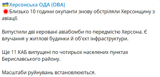 "Близько 10 години окупанти знову обстріляли Херсонщину з авіації. Випустили дві керовані авіабомби по передмісті Херсона. Є попадання в житлові будинки та об'єкт інфраструктури", - йдеться у повідомленні.