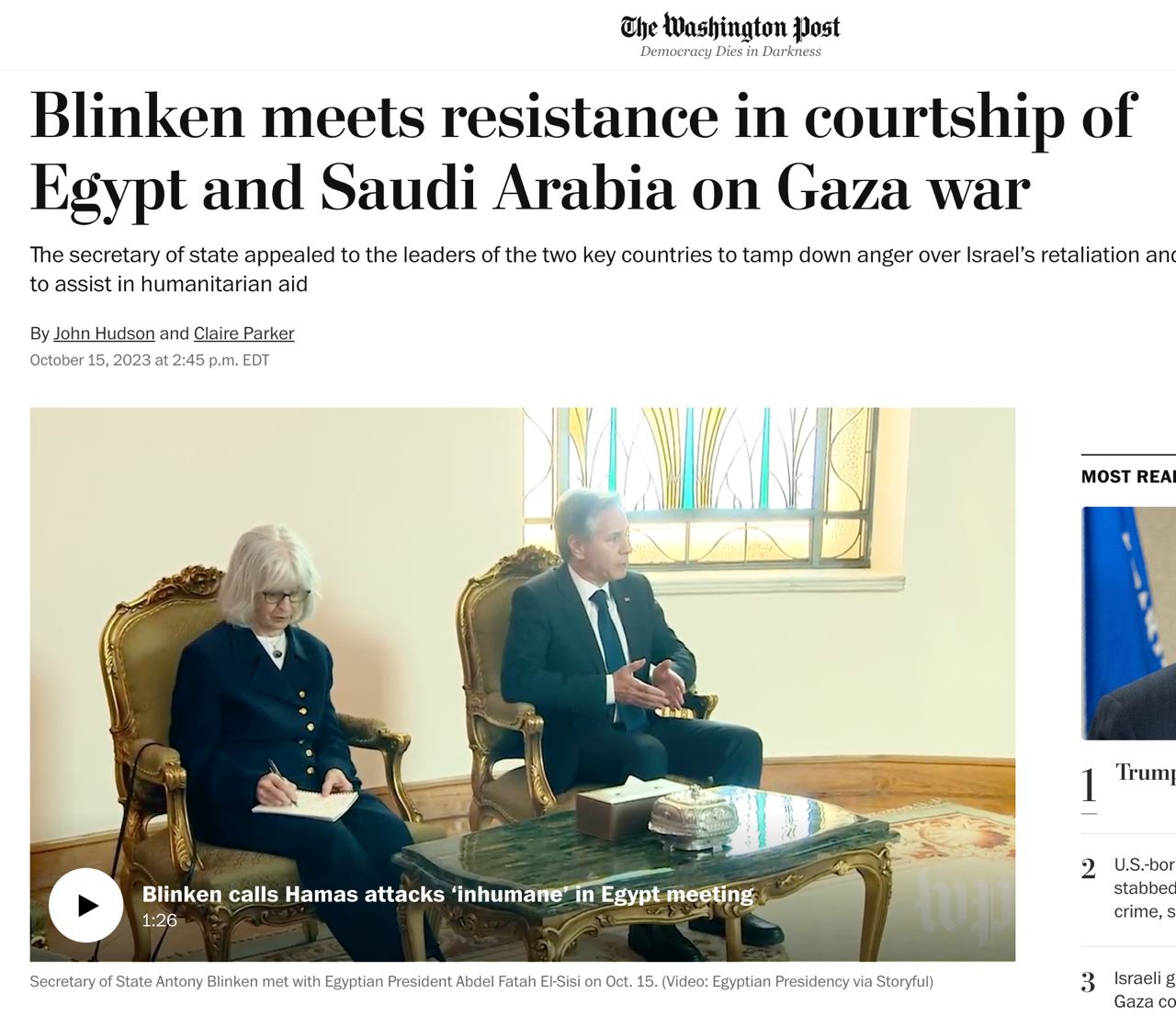 Держсекретар США Ентоні Блінкен "зіштовхнувся із запеклим опором найвпливовіших лідерів арабського світу", у чиїх країнах є "глибокі суспільні симпатії до палестинської справи", - Єгипту та Саудівської Аравії.