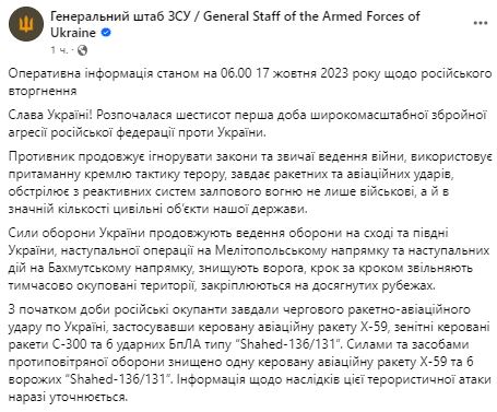 Вранці 17 жовтня Генштаб ЗСУ оприлюднив зведення про ситуацію на фронті.