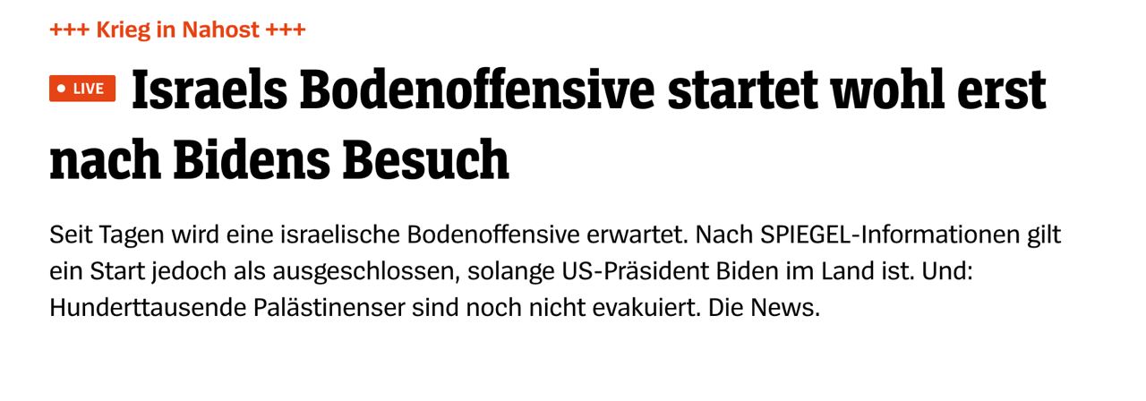 SPIEGEL пише, що наступ розпочнеться після візиту Байдену до Ізраїлю, який заплановано на завтра.