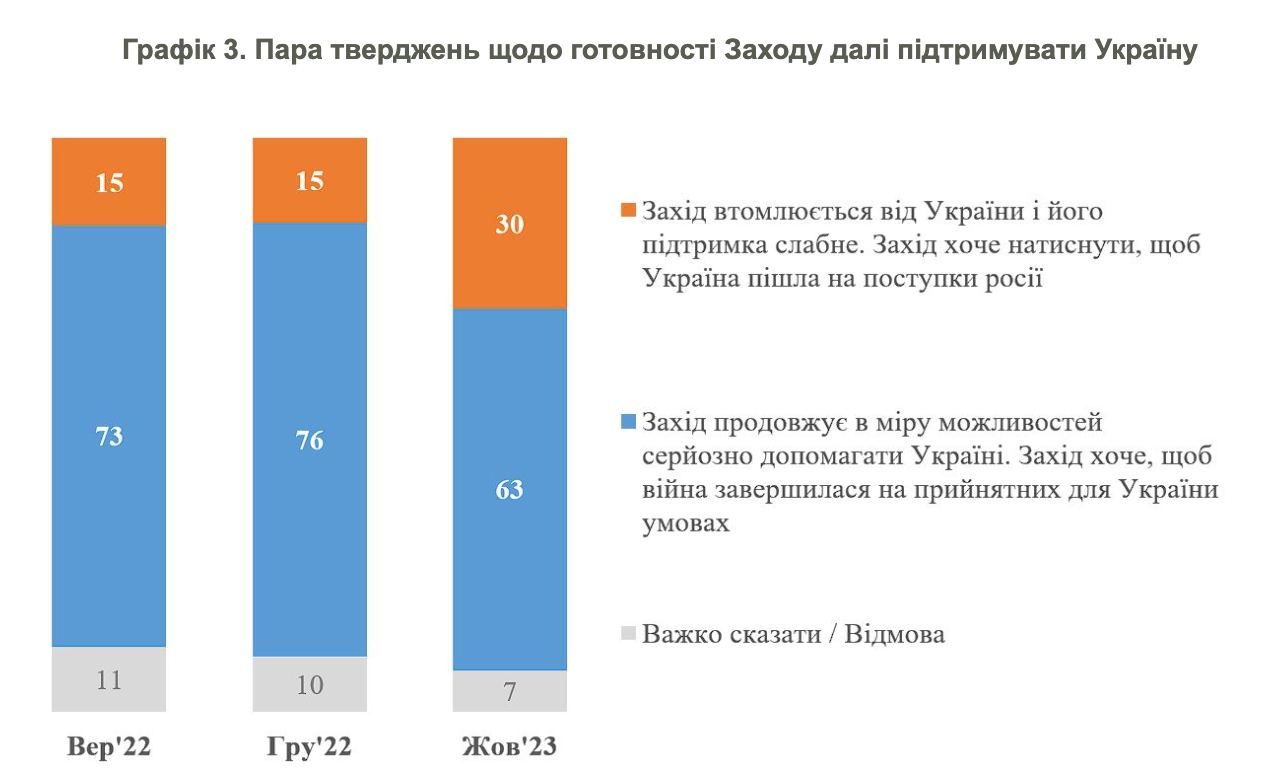 Про втому Заходу від України та послаблення підтримки заявили 30% опитаних. Рік тому їх було 15%. 63% вважають, що Захід продовжує допомагати Україні та хоче, щоб війна закінчилася на прийнятних для Києва умовах.