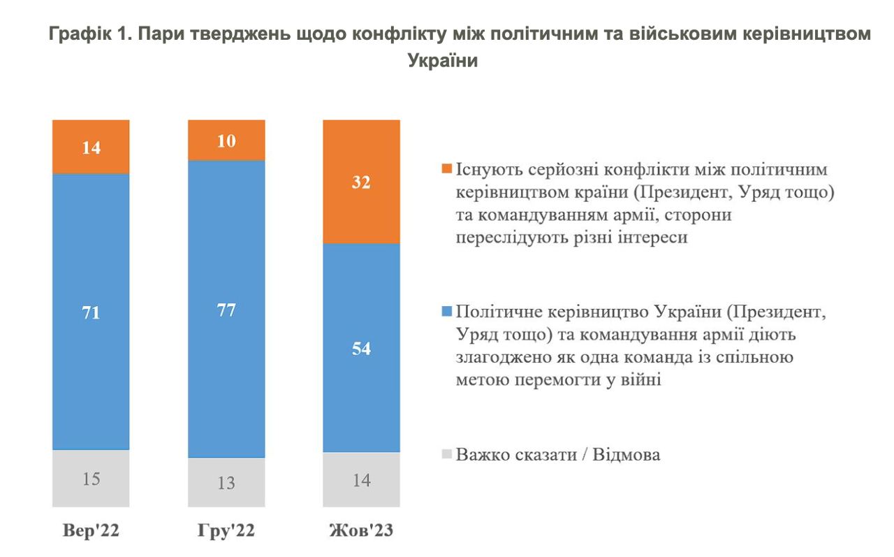 У конфлікти між політичним керівництвом країни та командуванням армії вірить 32%. Минулого року їх було 14%. 54% вважають, що військові та політики діють як єдина команда.
