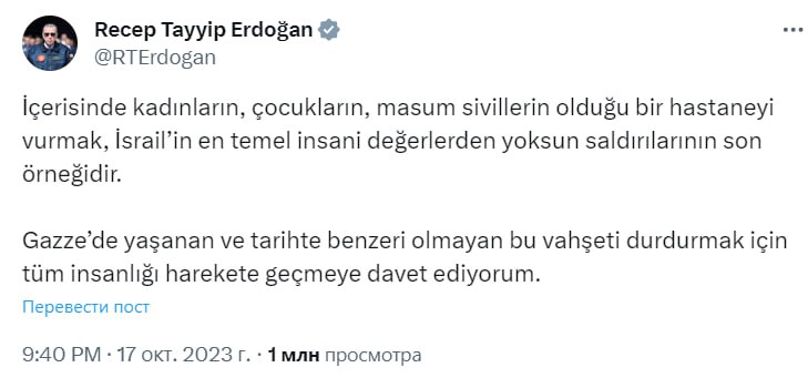 "Удар по лікарні, в якій знаходяться жінки, діти і ні в чому не винні мирні жителі - останній приклад ізраїльських атак, які зневажають найпростіші людські цінності. Я закликаю все людство вжити заходів, щоб зупинити це безпрецедентне злодіяння в Газі", - написав Ердоган..