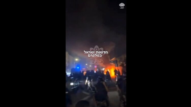 На кадрах заповнена збудженим натовпом вулиця, на задньому плані якої видно палаючу будівлю. Видно прапори Палестини, чути крики "Аллах Акбар!"