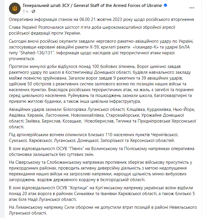 Війна в Україні триває вже 605-й день. Ми стежимо за останніми новинами та ключовими подіями 21 жовтня 2023 року в онлайні, що оновлюється.