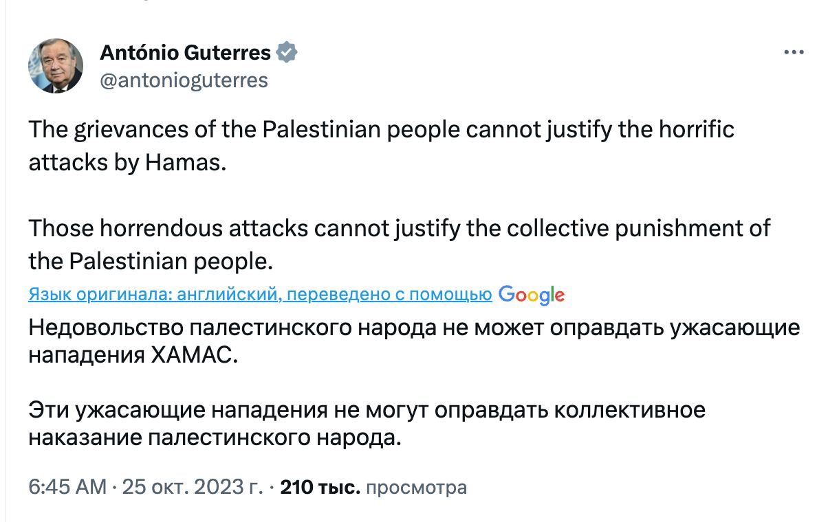 Генсек ООН Антоніу Гутерріш заявив, що не намагався виправдати вторгнення ХАМАСу до Ізраїлю. Але й Ізраїль за масові авіаудари за сектором Газа засуджує.