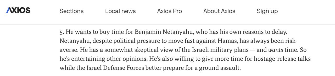 За його даними, прем'єр Ізраїлю хоче приділити більше часу переговорам про звільнення заручників, доки ЦАХАЛ готуватиметься до наземної операції.