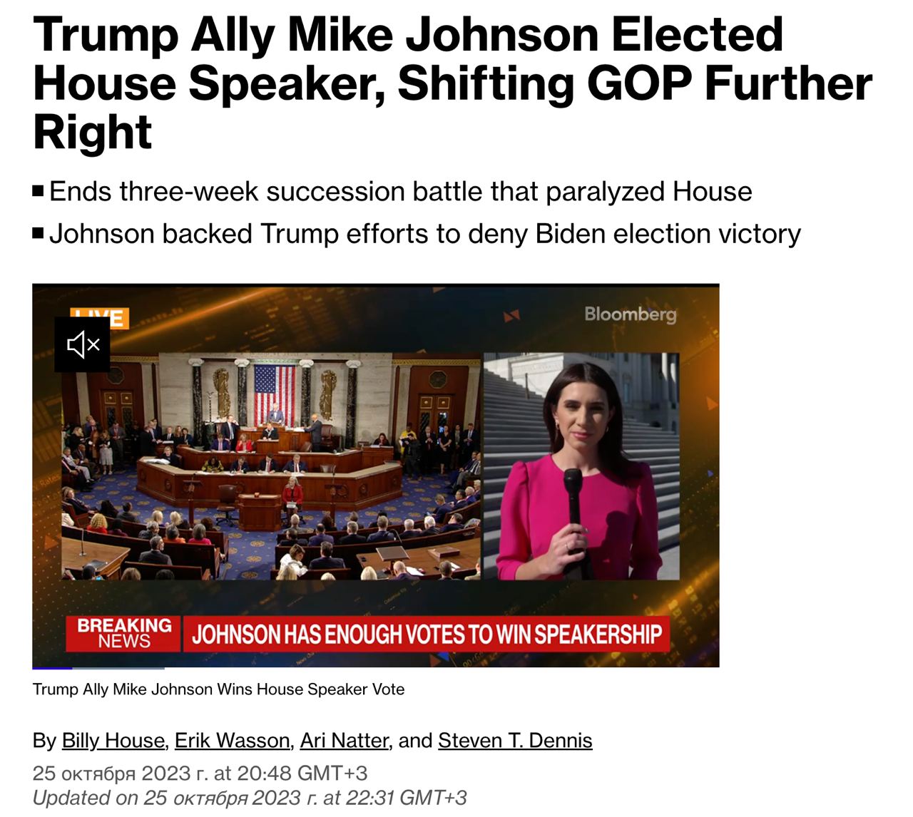 Нагадаємо, 25 жовтня республіканця Майка Джонсона обрано спікером Палати представників США. За 51-річного Джонсона з першого разу проголосували усі 220 присутніх республіканців. За професією новий речник адвокат, який спеціалізується на конституційному праві.