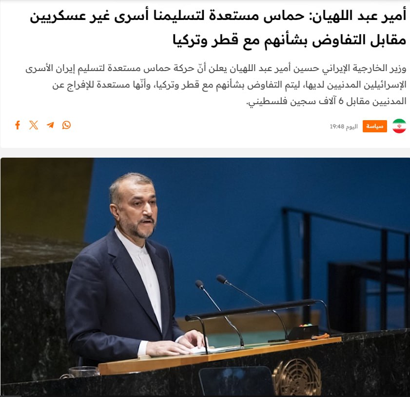 Міністр закордонних справ Ірану Хосейн Амір Абдоллахян оголосив, що рух ХАМАС готовий передати Ірану своїх ізраїльських цивільних ув'язнених за погодженням з Катаром та Туреччиною, а також звільнити мирних жителів в обмін на 6000 палестинських ув'язнених.