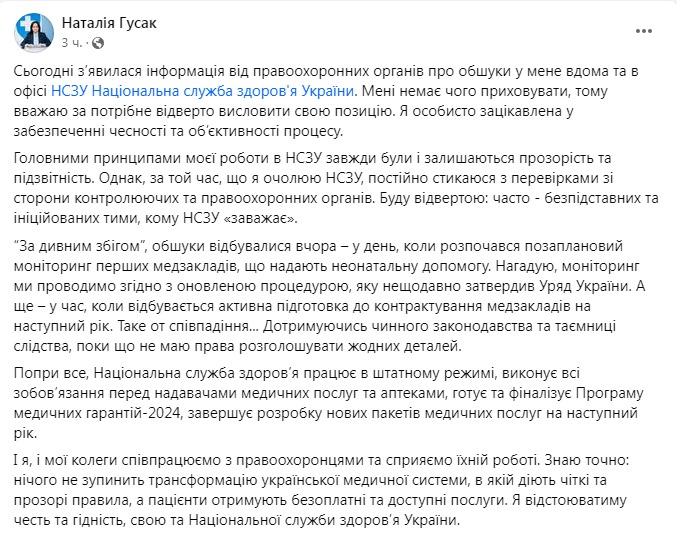 Сама Гусак заявила, що постійні перевірки її служби "безпідставні та ініційовані тими, кому НСЗУ заважає".