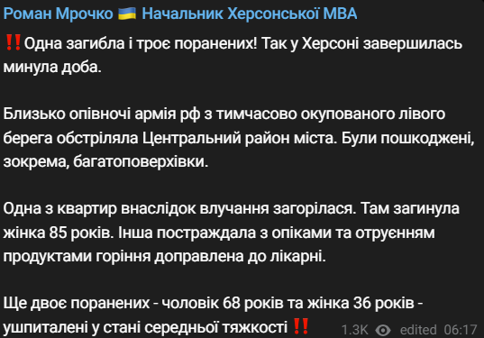 07:00 Вночі російські війська завдали удару Центральному району Херсона. Внаслідок обстрілу одна загибла та троє поранених, пошкоджено багатоповерхові будинки.