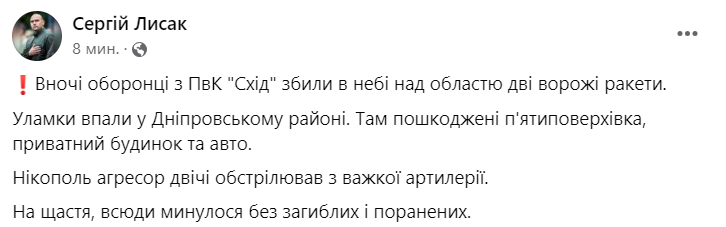 07:20 Сьогодні вночі над Дніпропетровською областю вночі збили дві ракети. Уламки впали в Дніпровському районі. Там пошкоджено п'ятиповерхівку, приватний будинок та автомобіль.