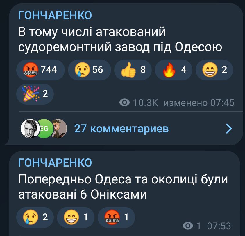 08:54 Нардеп Гончаренко заявив, що під Одеською атаковано судноремонтний завод.