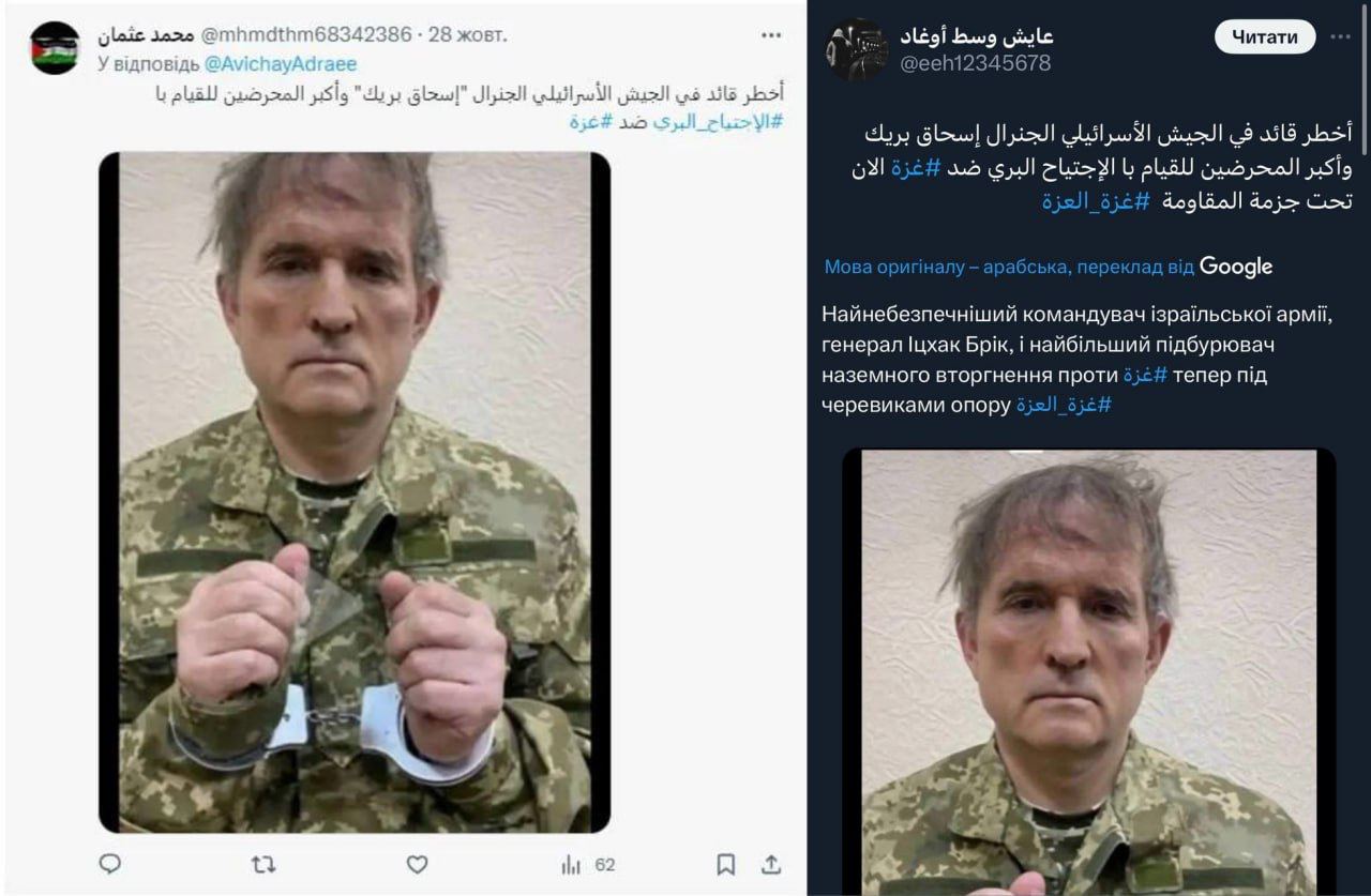В ізраїльських телеграм-каналах поширюється повідомлення, що пропалестинські акаунти в соцмережі X (раніше Twitter) повідомили про затримання генерала ЦАХАЛ Іцхака Бріка, супроводжуючи новину фотографією затриманого минулого року СБУ Віктора Медведчука.