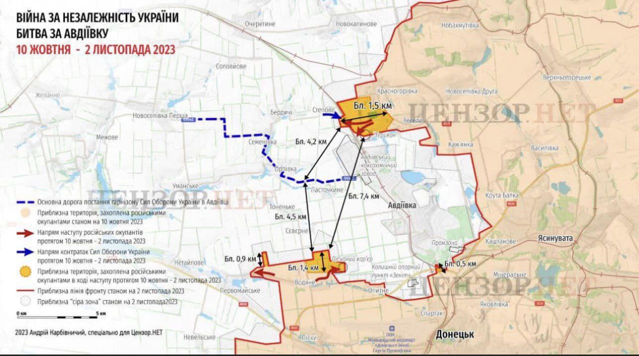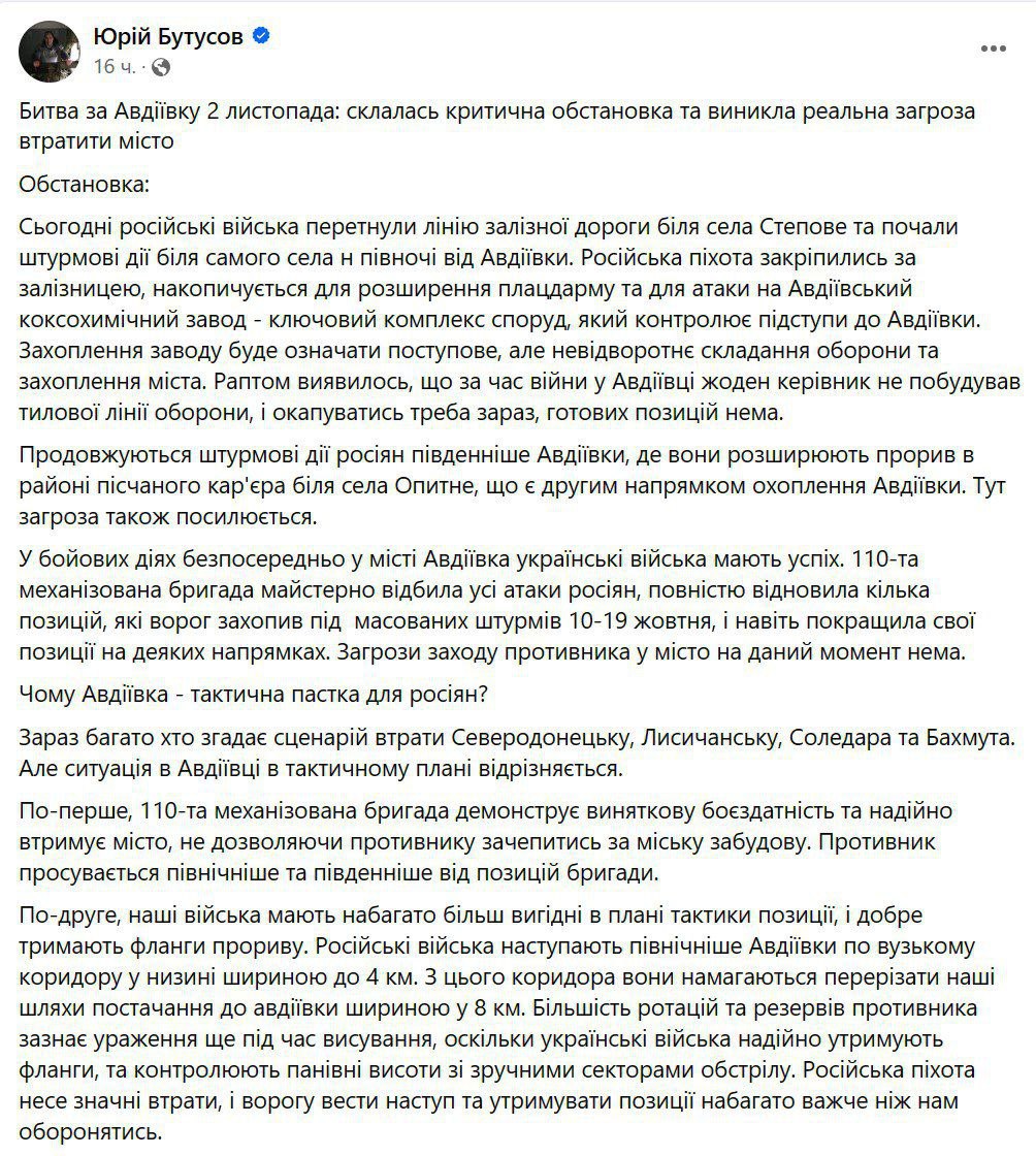 Також, за інформацією Бутусова, на південь від Авдіївки росіяни розширюють прорив у районі піщаного кар'єру біля Досвідченого.