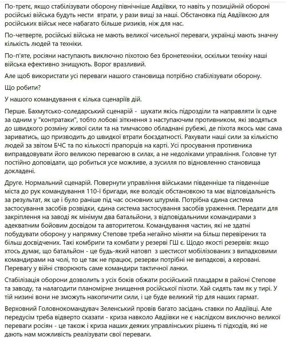 За його словами, "за час війни в Авдіївці жоден керівник не збудував тилову лінію оборони, і окопуватися треба зараз, готових позицій немає" (раніше про те ж говорив і екс-радник Банкової Олексій Арестович).