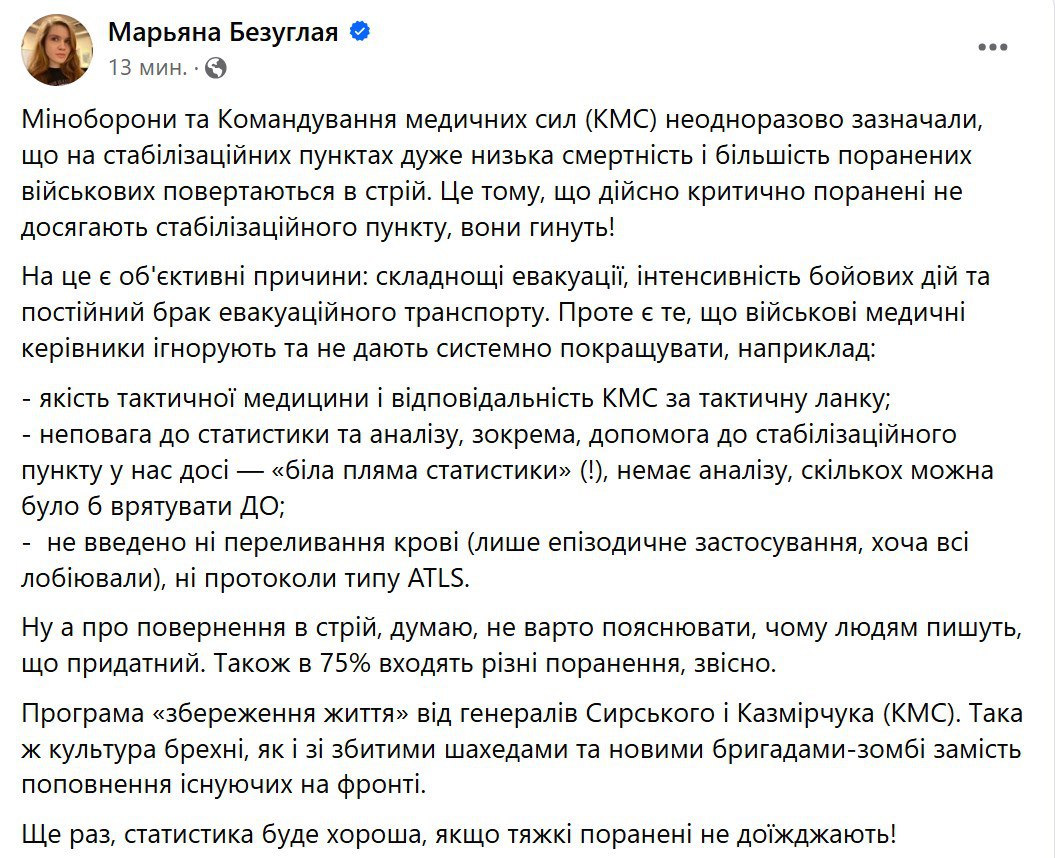 Причиною цього, окрім складнощів евакуації під час бою, Безугла назвала низьку якість тактичної медицини, проблеми з переливанням крові та статистикою підрахунку.