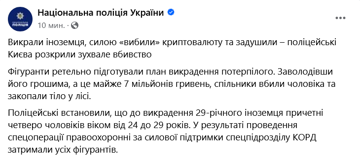 За даними правоохоронців, банда із чотирьох осіб викрала 29-річного іноземця та "вибила" з нього криптовалюти на 7 мільйонів гривень. Потім чоловіка задушили і закопали у лісі.