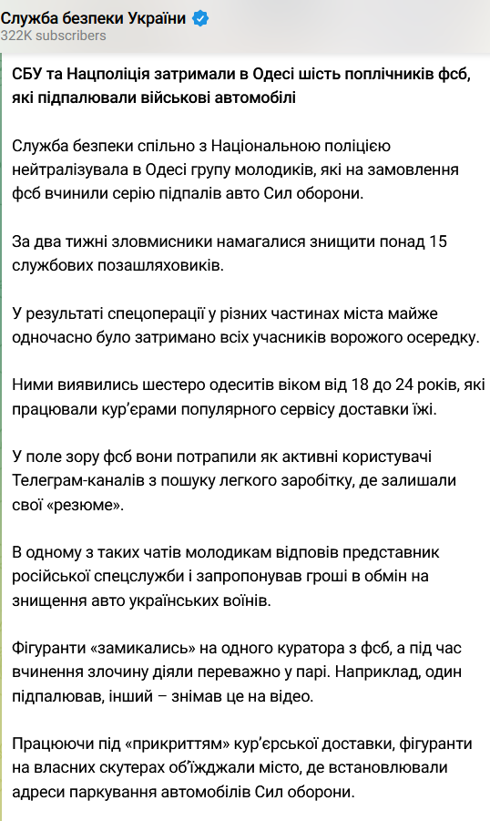Стверджується, що "роботу" щодо знищення машин вони знайшли в одному з телеграм-каналів із швидкого заробітку грошей. Там, як заявляє СБУ, на них вийшли російські спецслужби.