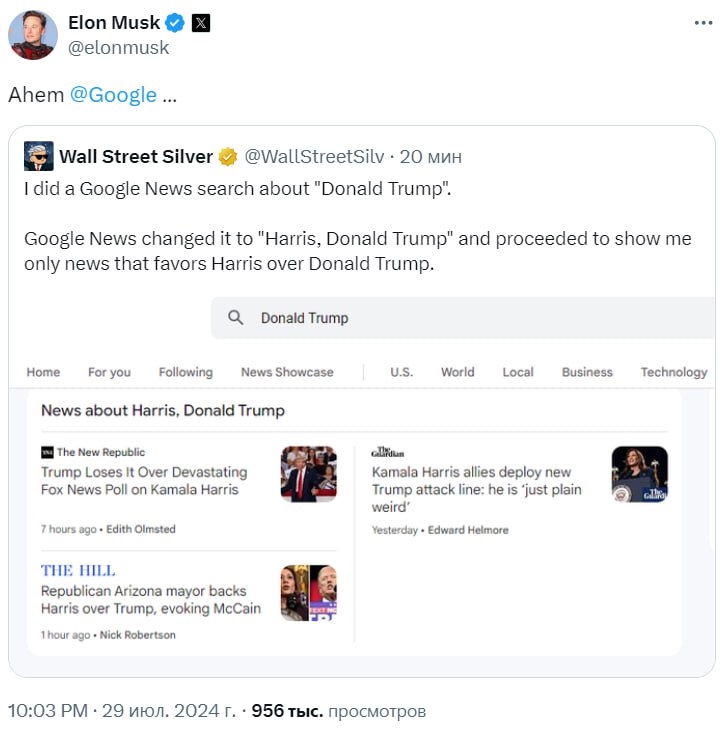 Мільярдер стверджує, що пошуковик блокує запити про Дональда Трампа або супроводжує їх значною часткою інформації про ймовірного кандидата від демократів Камалу Харріс (у видачах про неї конкурент-республіканець у такому обсязі не згадується).